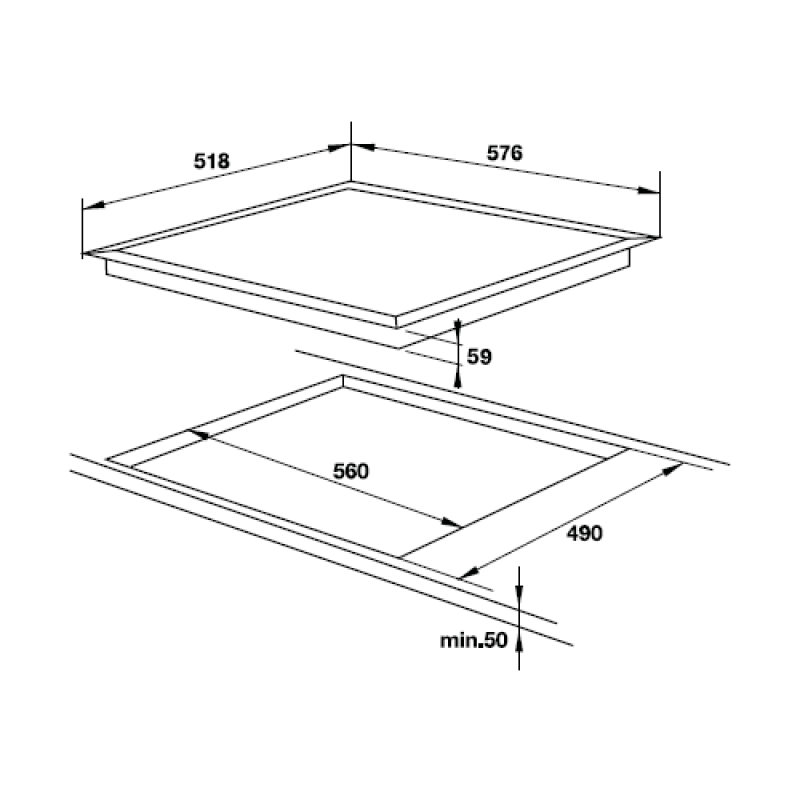 - Kích thước lắp đặt: 560R x 490S x min50C mm